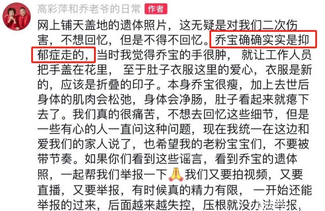 乔任梁的父母在社交平台发声,澄清儿子乔任梁是因抑郁症去世的。他们表示,乔任梁的离世对他们来说是巨大的打击,而网络上流传的关于乔任梁死因的不实言论和遗体照片更是对他们造成了二次伤害。