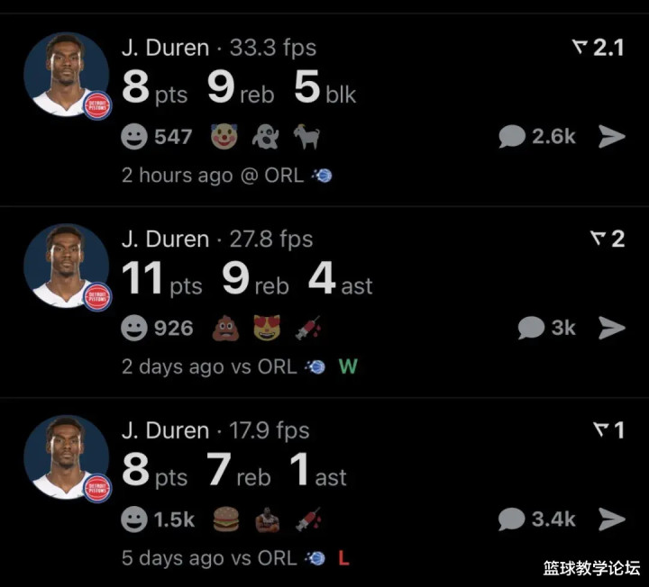 活塞二当家杰伦-杜伦延续了之前的糟糕表现,仅打了27分钟就6犯离场。此役杜伦投篮10中3,罚球2中2,得到8分9篮板1助攻5盖帽2失误6犯规。系列赛前两场,杜伦分别得到8分7篮板3失误和11分9篮板4助攻3失误,真的太软了!