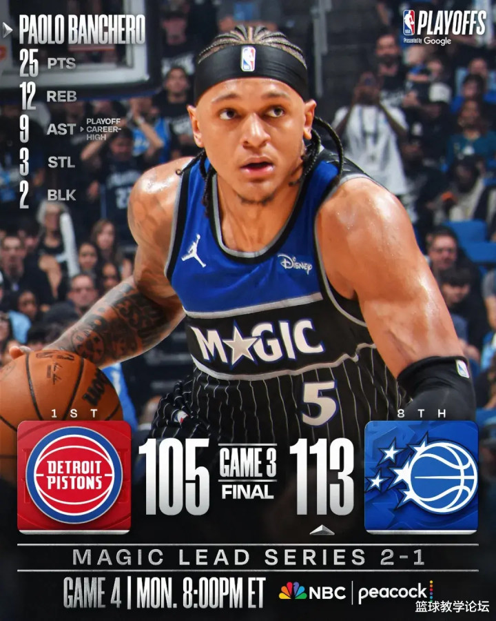 今年季后赛会有黑八奇迹吗?真的有可能!魔术主场113-105力克活塞,总比分2-1再度领先。四节比分(活塞在前):26-26、28-35、25-26、26-26。末节坎宁安率领活塞一度反超,班凯罗命中关键三分,魔术一波9-0锁定胜局。